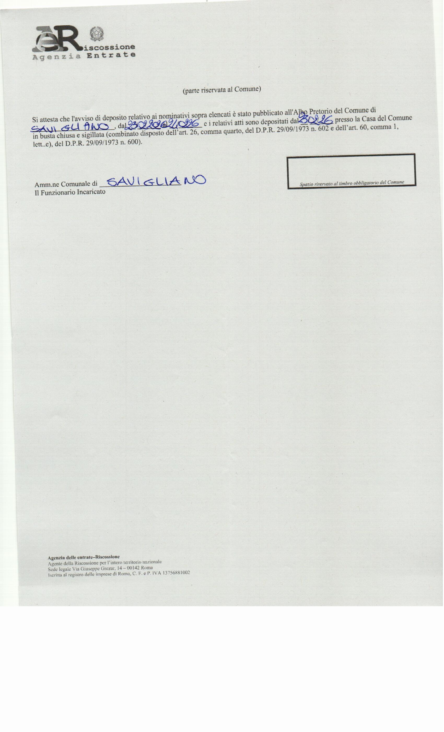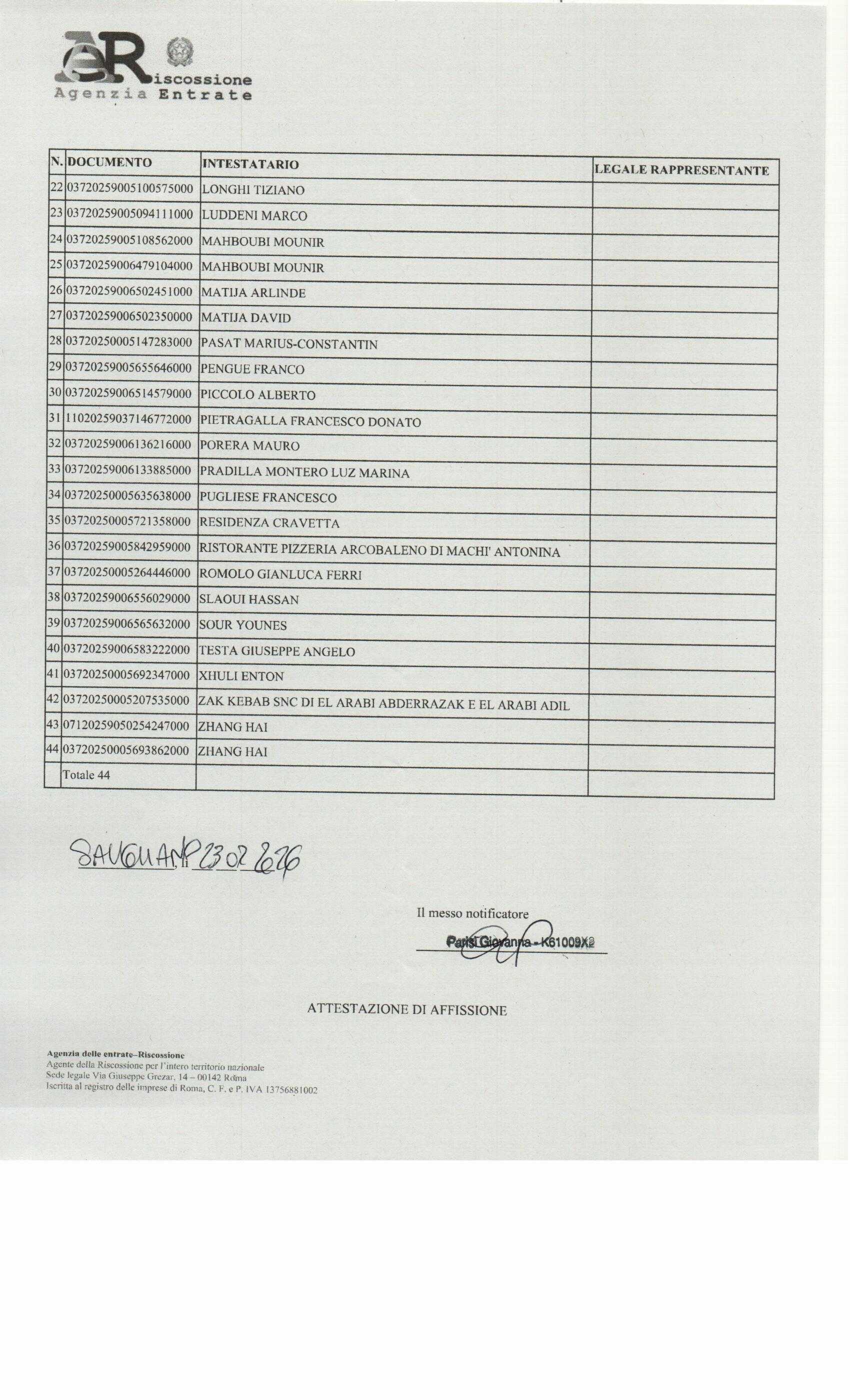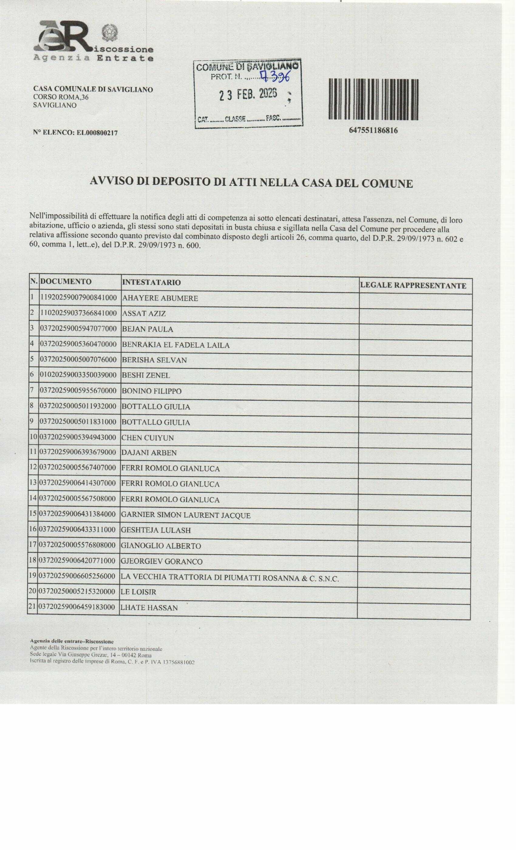 Protocollo n.: 7396 del 23/02/2026 AVVISO DI DEPOSITO ATTI NELLA CASA DEL COMUNE PER L'AFFISSIONE ai sensi art. 26 D.P.R. 602/1973 e art. 60 D.P.R. 600/1973: n. 44 atti di Ahayere Abumere ed altri |